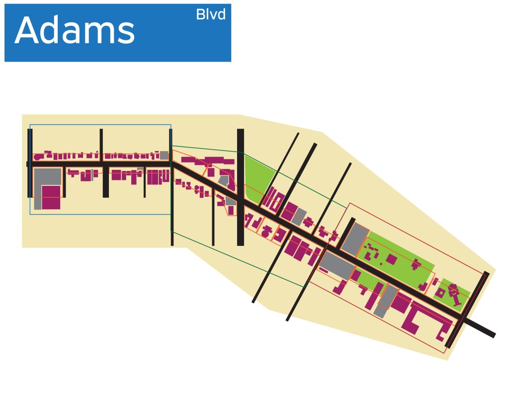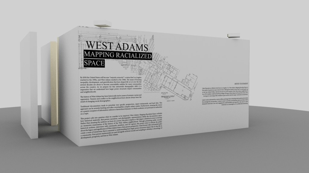 This project examines public records, historical archives, and interviews with community members to better understand how changing demographics affect urban development across Los Angeles. In order to communicate these findings to an audience, a one-mile-long stretch of Adams Boulevard–-from Figueroa to Vermont–-was extensively surveyed, photographed, and digitally reconstructed. Recreations of historic structures display homes lost to eminent domain and paint a picture of a thriving neighborhood dismantled by the construction of the I-10 Freeway.